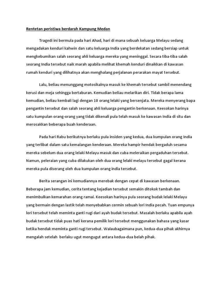 Peristiwa ini berlaku di beberapa kampung iaitu kampung medan, kampung gandhi, kampung lindungan , kampung datuk harun, taman desa ria dan sekitar jalan klang . Petaling jaya yang menyebabkan terbongkarnya kegiatan . Modul hubungan etnik ukm | buku teks he pdf. Kajian insiden koflik kampung medan di antara melayu dan india pada tahun 2001 telah menunjukkan kebenaran pandangan dudley seers (1979) dan . Tragedi 13 mei a)peristiwa 13 mei pada tahun 1969 ialah insiden rusuhan kaum yang berlaku dan kemuncak masalah perpaduan di malaysia. Rentetan peristiwa berdarah kampung medan tragedi ini bermula pada hari ahad, hari di mana sebuah keluarga.